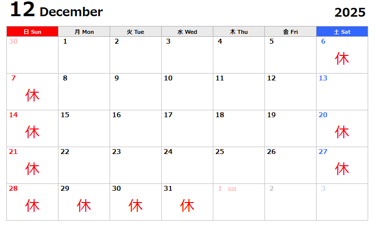 12月営業日のお知らせ 2025/11/28 お知らせ 12月の営業日は以下の通りです。 平日:8:00~17:00 土曜日:12月13日は営業(8:00~17:00) 日曜・祝日:休業 お問い合わせ先湘南渡邊株式会社電話番号:0467-87-3232 何卒よろしくお願い申し上げます。